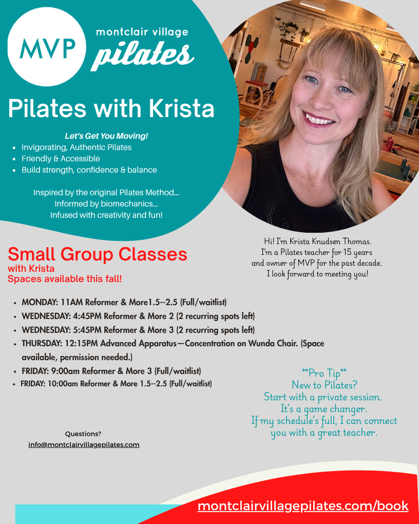 If you are a new client and would like to join group classes, I require at least one private session, or that you attend an Introduction to Group Pilates workshop (email for dates; signups are private.) This is vital for safety, and to ensure a quality class experience for you, as well as all students.